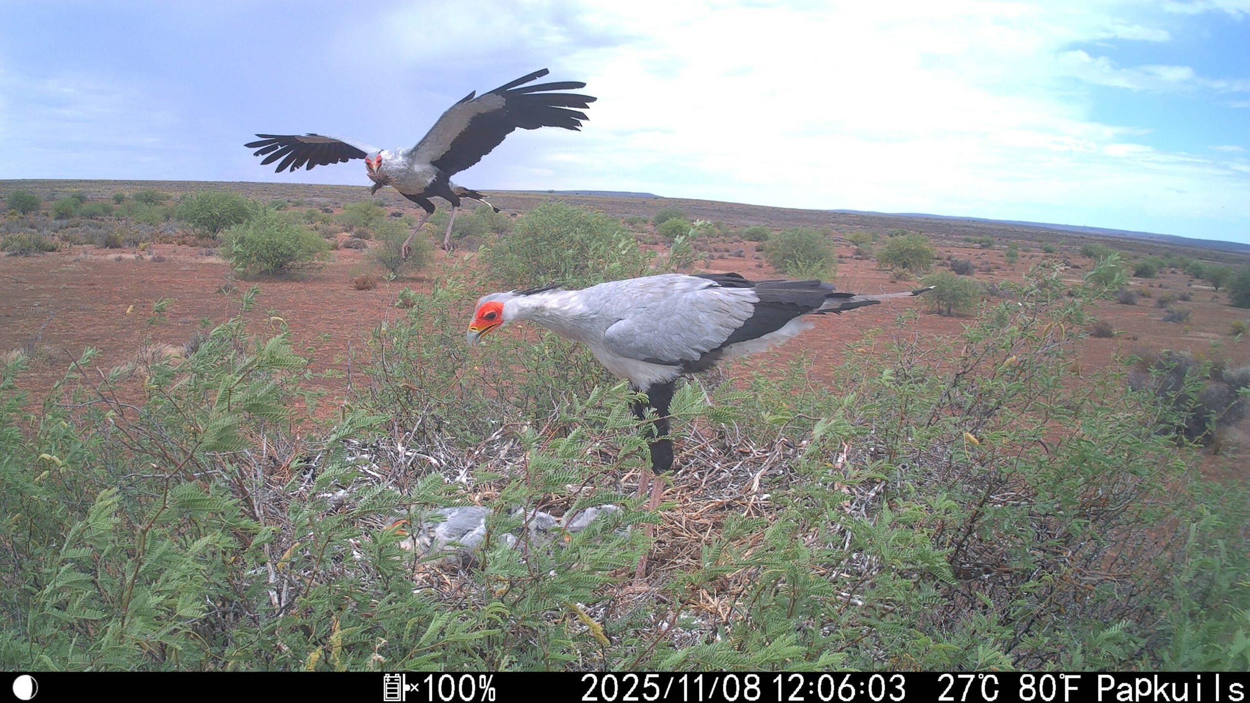 The Secretarybird is a charismatic raptor of African landscapes. With its distinctive long legs and feathered crest, this species is both genetically and morphologically unique. Listed as Endangered and with a high EDGE score, recent research indicates they have declined by as much as 89% in Kenya and 82% in Botswana, with significant population declines also detected in South Africa. Despite their conservation status, critical knowledge gaps remain. Understanding the causes of breeding failures, identifying ways to improve nesting success, and learning about their movement ecology are essential for informing effective conservation strategies. Additional knowledge gaps exist related to the impacts of wind turbines and responses to climate change. To support these efforts, HawkWatch International launched a study on Secretarybirds in 2023 in the Western Cape of South Africa—the southernmost part of their range—using camera traps, GPS transmitters, and nest monitoring.