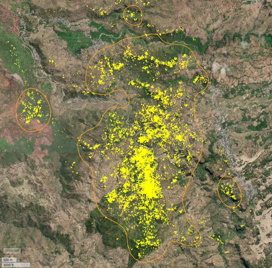 One year of tracking data (yellow dots) from a Flores Hawk-eagle, and a 95% autocorrelated kernel estimate home range (orange line).